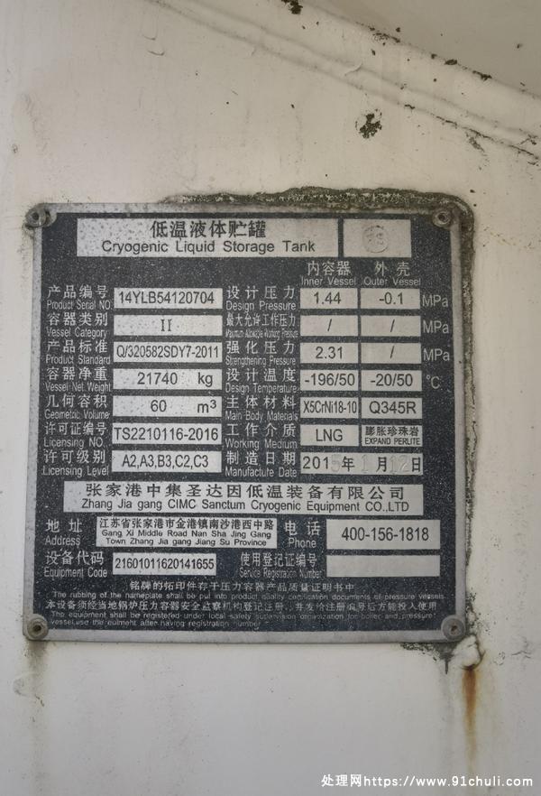15年产圣达因60方LNG天然气高压立式储罐,设计压力1.44MPa,出厂资料齐全,压力容器移装证已开,保真空。