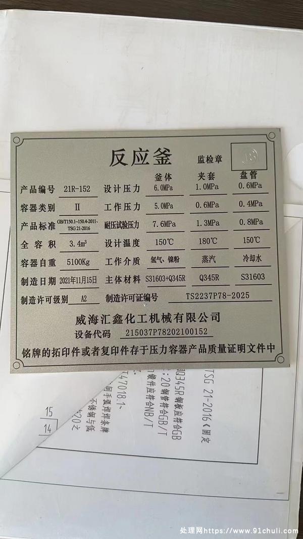 新订2021年11月份威海汇鑫产3.4立方高压反应釜,316不锈钢材质,工作压力60公斤,配套手续齐全,需要联系。
