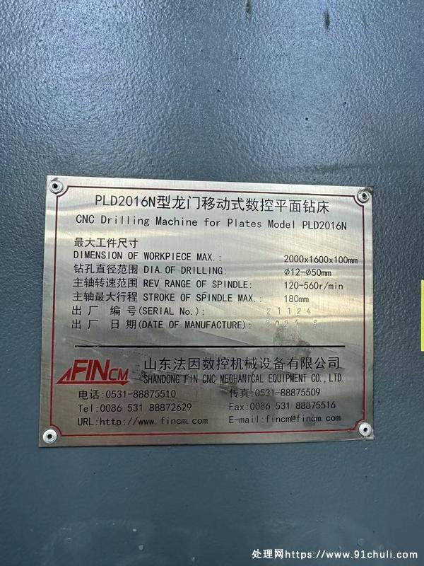 2021年法因2016数控龙门钻床,最大工件尺寸2000×1600×100mm,钻攻直径12-50mm,安装少用,要的联系!
